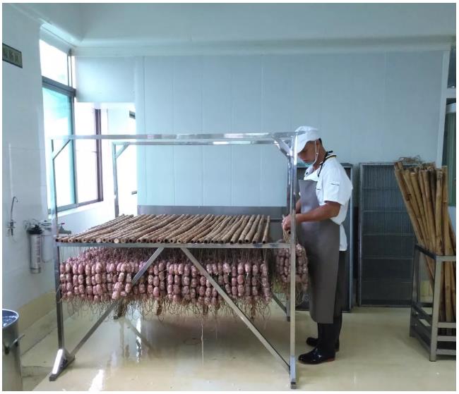 腊肠捆绑完成后,要将腊肠清洗干净。清洗过后便可将腊肠挂起风干等待入炉。